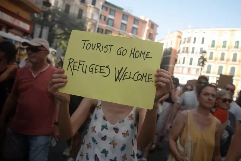 Присутствующие скандировали: «Ваш отпуск — мое несчастье» и держали в руках плакаты с надписями: «Массовый туризм убивает город» и «Их жадность губит нас».
