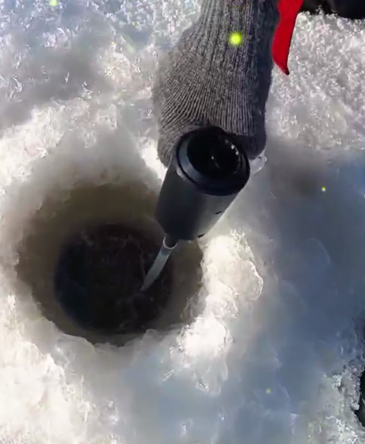Волонтеры «Витязи» с помощью ледобуров бурят лунки и, чтоб кислород как можно дольше поступал в через них, вставляют чарот, загоняя воздух портативным компрессором.
