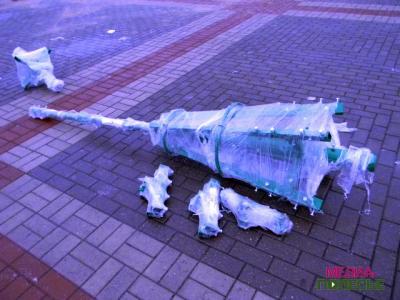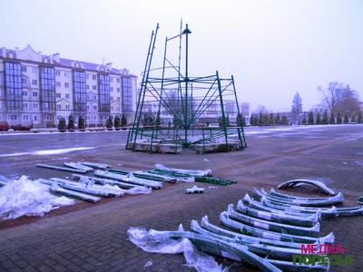Рабочие уже начали монтаж металлоконструкций на площади Ленина. По их словам, сооружение будет около 15 метров выстой, а на металлический каркас прикрепят ветви натуральных елей.