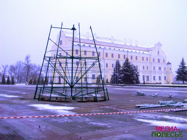 Рабочие уже начали монтаж металлоконструкций на площади Ленина. По их словам, сооружение будет около 15 метров выстой, а на металлический каркас прикрепят ветви натуральных елей.