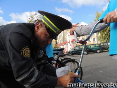 Старший инспектор дорожно-патрульной службы отдела ГАИ Столинского РОВД Виталий Ковальский провёл с участниками инструктаж о ходе велопробега и наклеил светоотражающие элементы на велосипед каждого велосипедиста.