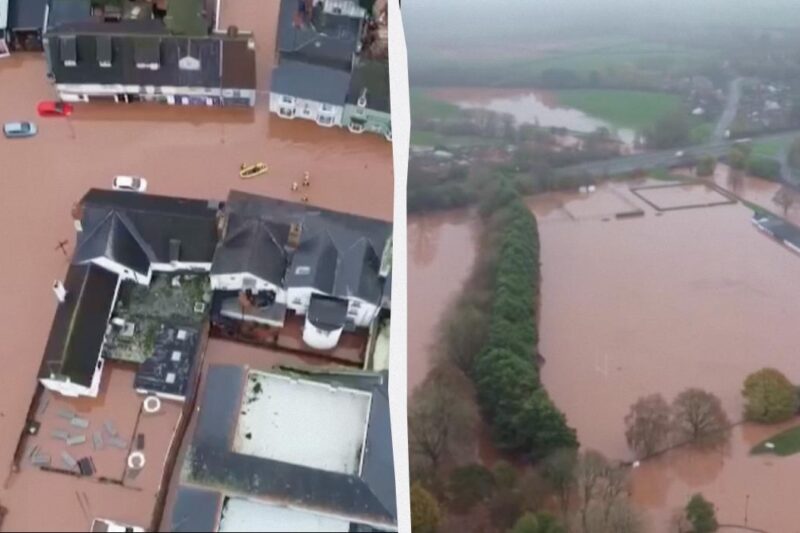 На кадрах с последствиями наводнения в Монмуте видно, что вода затопила центр города и жилые районы.