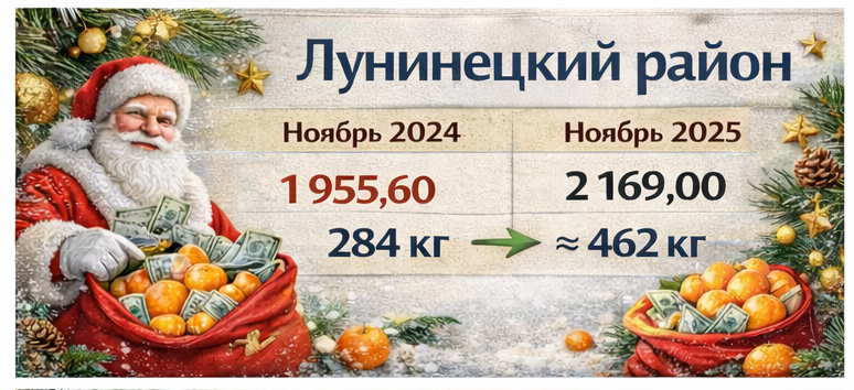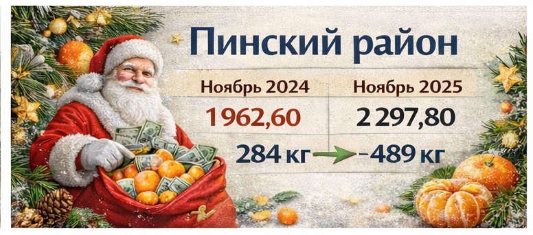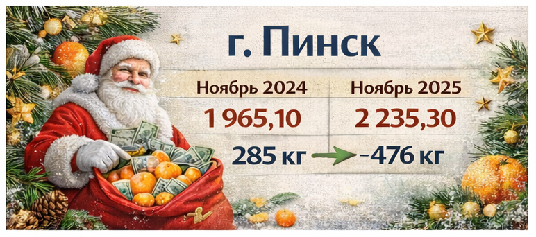 За год средние зарплаты в Пинске и районах Полесья заметно выросли. Но сухие проценты мало что говорят обычному человеку. Поэтому мы посмотрели на изменения проще — через доллар и через самый главный новогодний продукт - мандарины.
