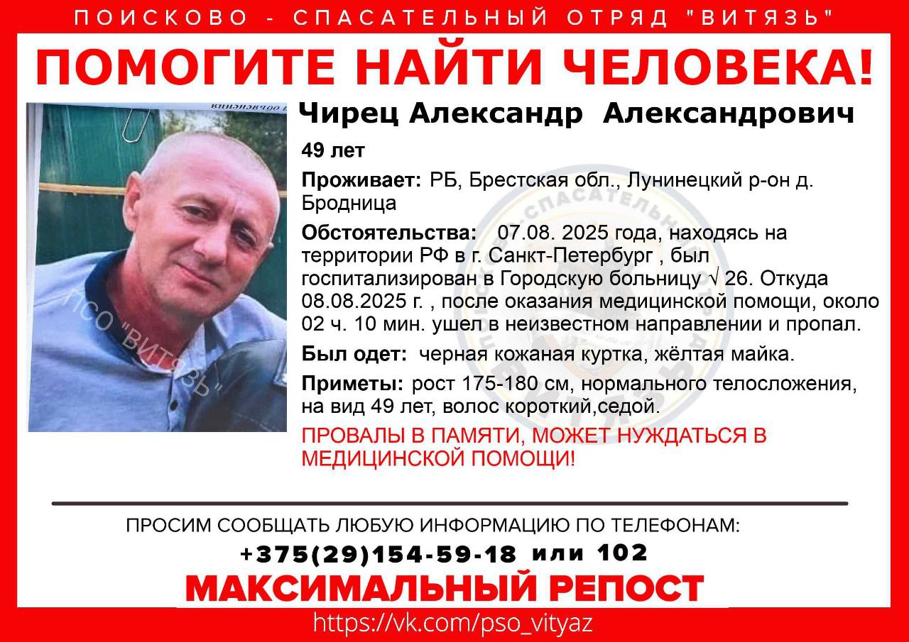 Жителя Лунинецкого района, работая в питере, был госпитализирован. После получения медпомощи покинул больницу и пропал