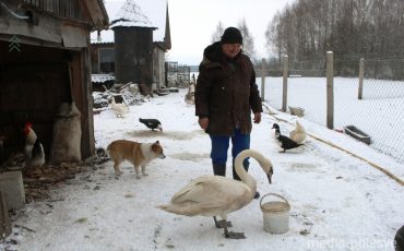 Как лебедь прижился среди гусей на подворье в Пинском районе